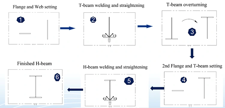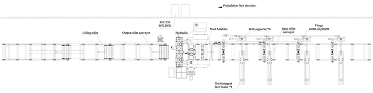 Einige Kunden müssen möglicherweise die Produktionsleistung erhöhen. Sie benötigen eine Schweißlinie, um 2 Sätze Schweißstation zu bestehen. Die erste Schweißstation zum Schweißen von 1. Flansch und das Netz, um einen T-Strahl zu bilden, das 2. zum Schweißen des geschweißten T-Beams und des 2. Flansches, um einen H-Strahl zu bilden.