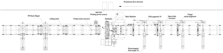 Die Standard-Schweißlinien von ZHJ3-In 1-H-Strahlschweißen bestehen aus einem Eingangsroller-Tisch, Hauptschweiß- und Richtstation, OutputRoller-Tisch. Auf die Hauptschweiß- und Richtstation, die dort mit Flusswiederherstellungseinheiten installiert ist, schweißen Sie den Kopf mit Brennerfackel und Klemmgeräten für Flansch- und Web-Leitung.